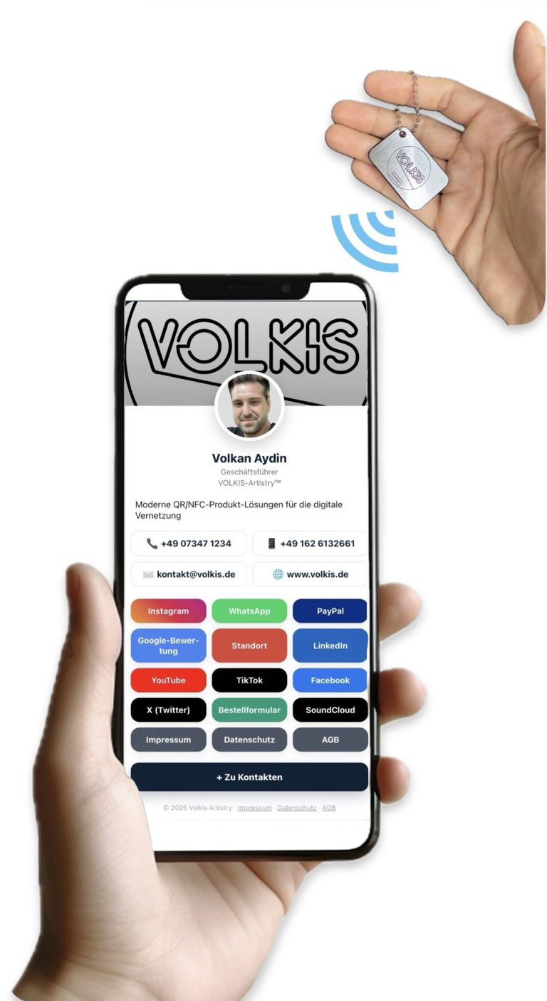 Verbinden Sie Ihre NFC-Card Mini mit einem VOLKIS Connect-Profil – einem maßgeschneiderten Online-Profil, das alle Ihre Kontaktdaten, Links und relevanten Informationen enthält. Diese optimale Integration ermöglicht es Ihnen, Ihre VOLKIS NFC-Card, Card Mini oder einen NFC-Key Tag effizient zu verwenden.